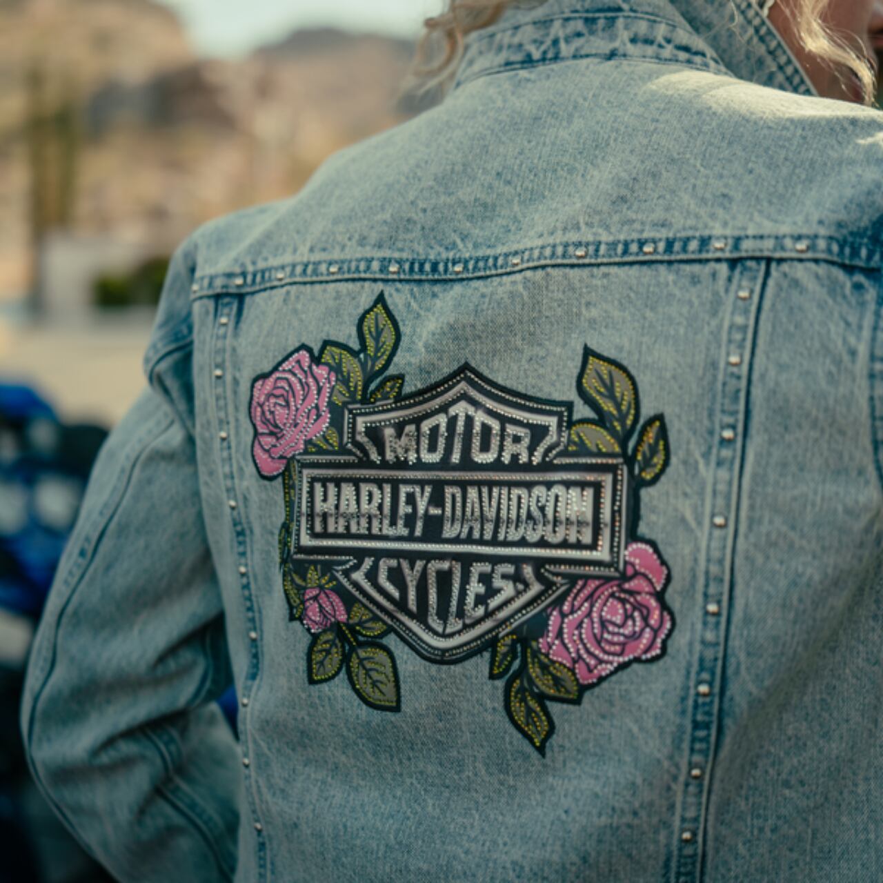 バックには咲き誇るバラに囲まれたバー&シールドの美しいパッチとスタッズが施されており、どんなシーンでも目を引くデザインとなっています。