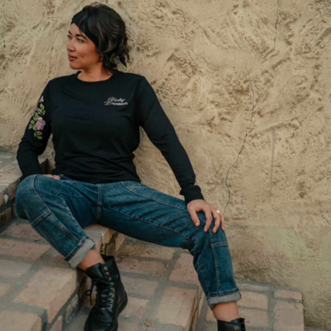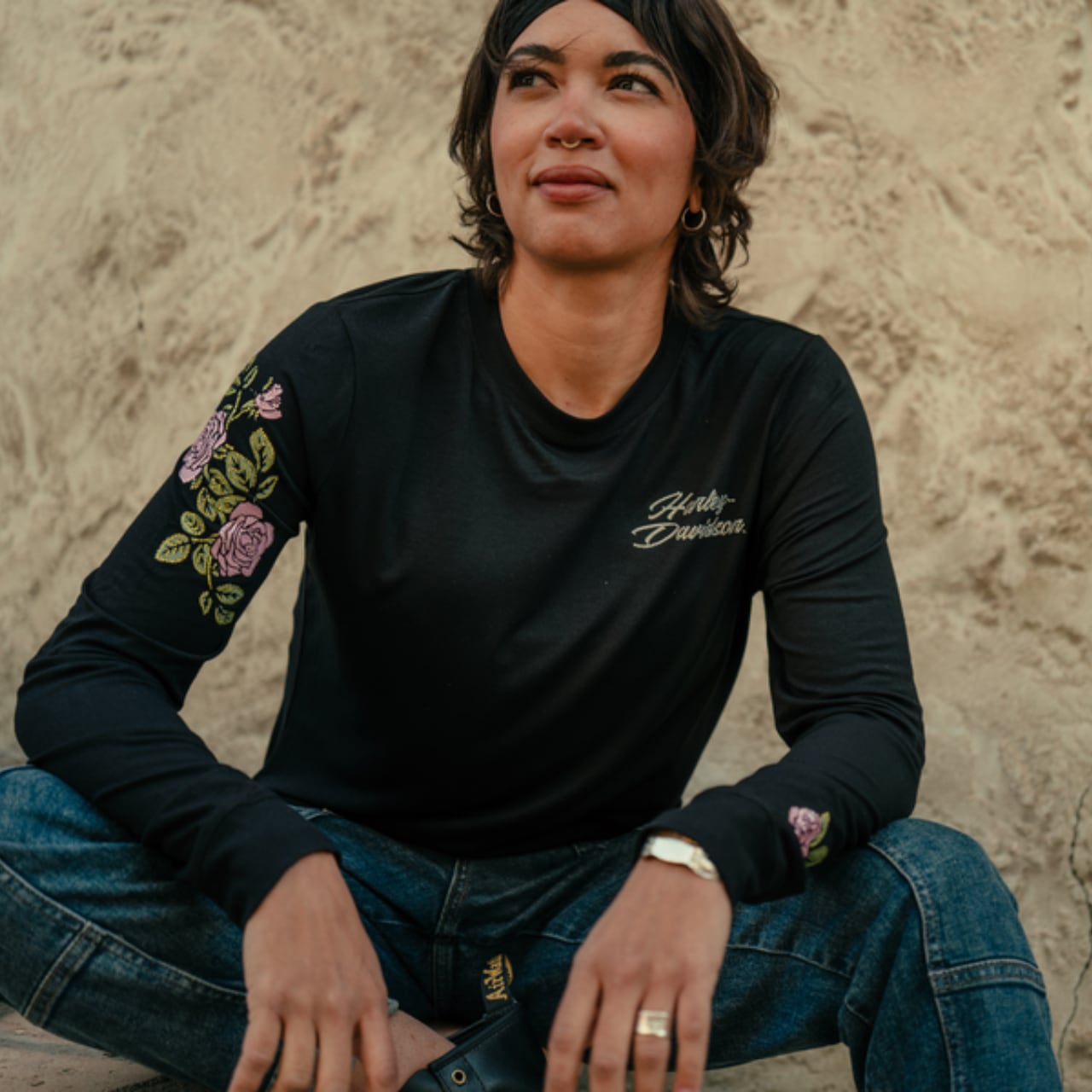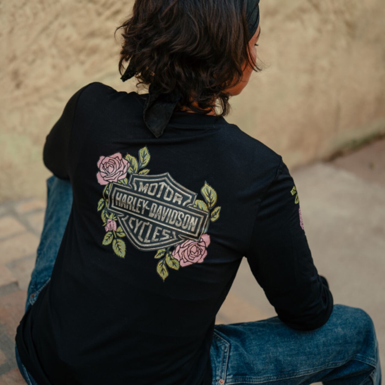フロントにはHarley-Davidosn®スクリプトロゴ、バックにはバー&シールドとバラ、右腕と左袖にもバラのアクセントがあり、さらにラインストーン装飾で華やかさをプラスしています。