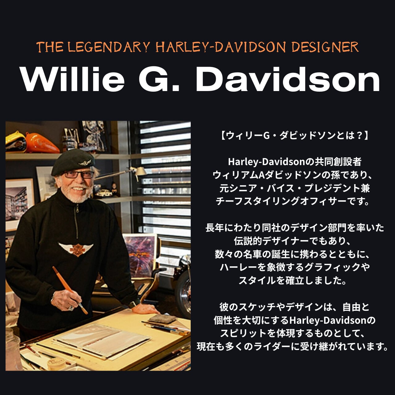 ハーレーの創始者の1人ウィリアム・A・ダビッドソンの孫であり、アイコニックな存在であるウィリー・G・ダビッドソンによる実際のスケッチとサイン入りのアートワークが特徴。
