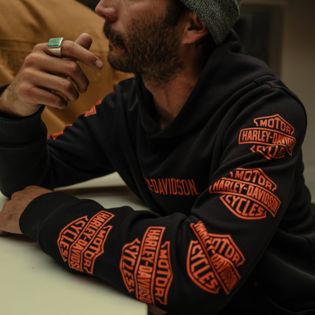 フロントに施されたHarley-Davidson®のロゴ刺繍と、両袖のバー&シールドグラフィックプリントがより一層魅力を引き立てるデザインです。