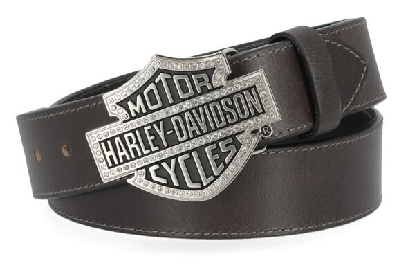 マットガンメタル仕上げでラインストーンをあしらったバー&シールドのバックルは、交換可能で、お好みに合わせてアレンジ可能です。