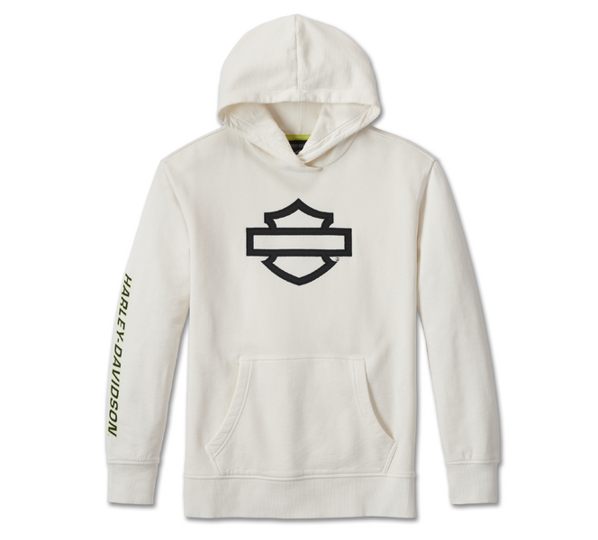 フロントにはオープンバー&シールドの豪華なサテンアップリケ、袖にはHarley-Davidson®スクリプトロゴのプリントが施されており、シンプルながらも存在感のある一着です。
