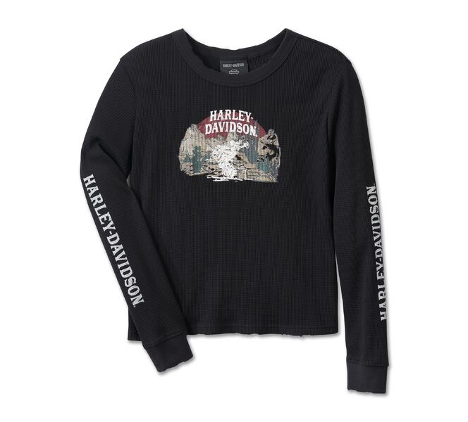 ダメージ加工のディテールとウエスタン風のグラフィックが、ノスタルジックなハーレーダビッドソンルックを演出し、ヴィンテージ感たっぷりの一枚です。