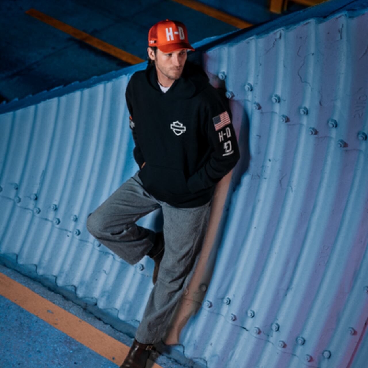 フロントにはH-D®刺繍アップリケ、サイドにはアメリカ国旗とエンジンを象徴する131Rの刺繍が施されており、バックにはチームロゴを配置!