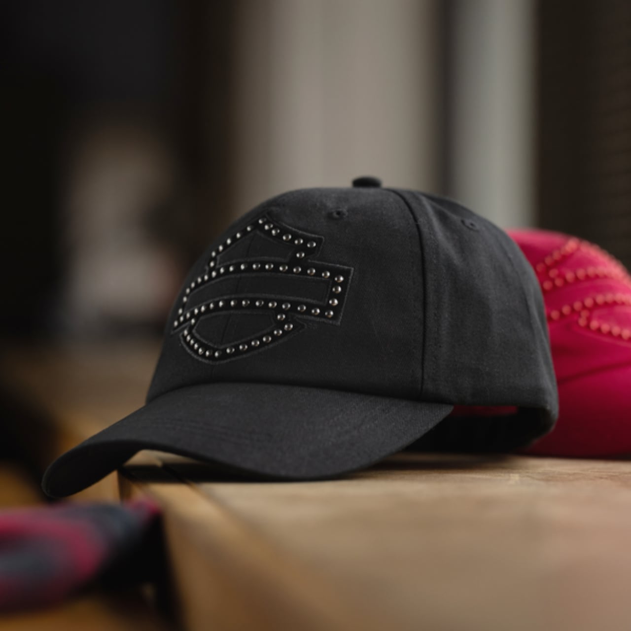 バー&シールドのメタルスタッズが華やかさをプラスした、スタイリッシュなベースボールキャップ!