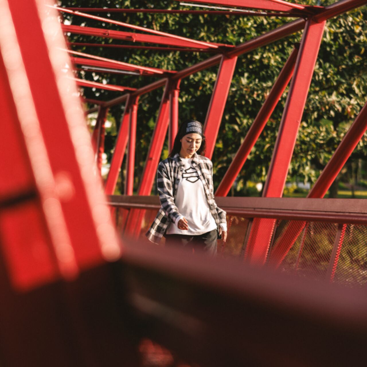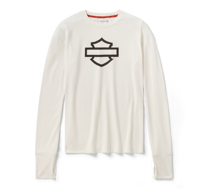 ・デザイン詳細:セットインネックバンド、ショルダーパネルディテール、カバーステッチディテール、サムホール付きカフス、折り返し裾