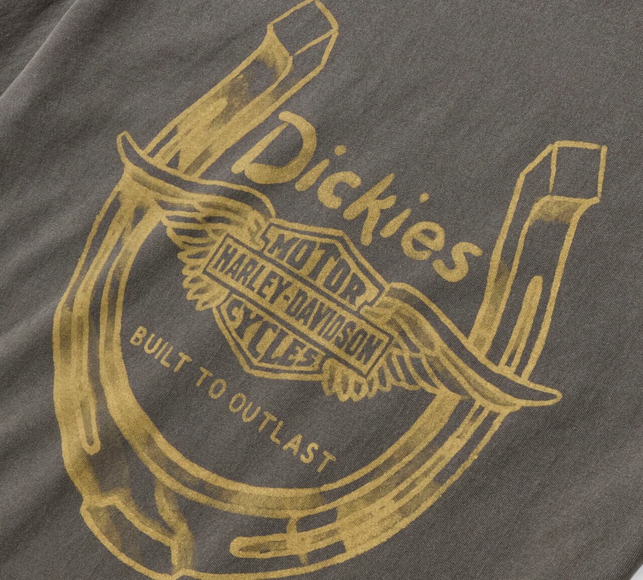 ディッキーズのホースシューとハーレーダビッドソンの1930年代のシルバーウィングロゴが絶妙に融合しています。