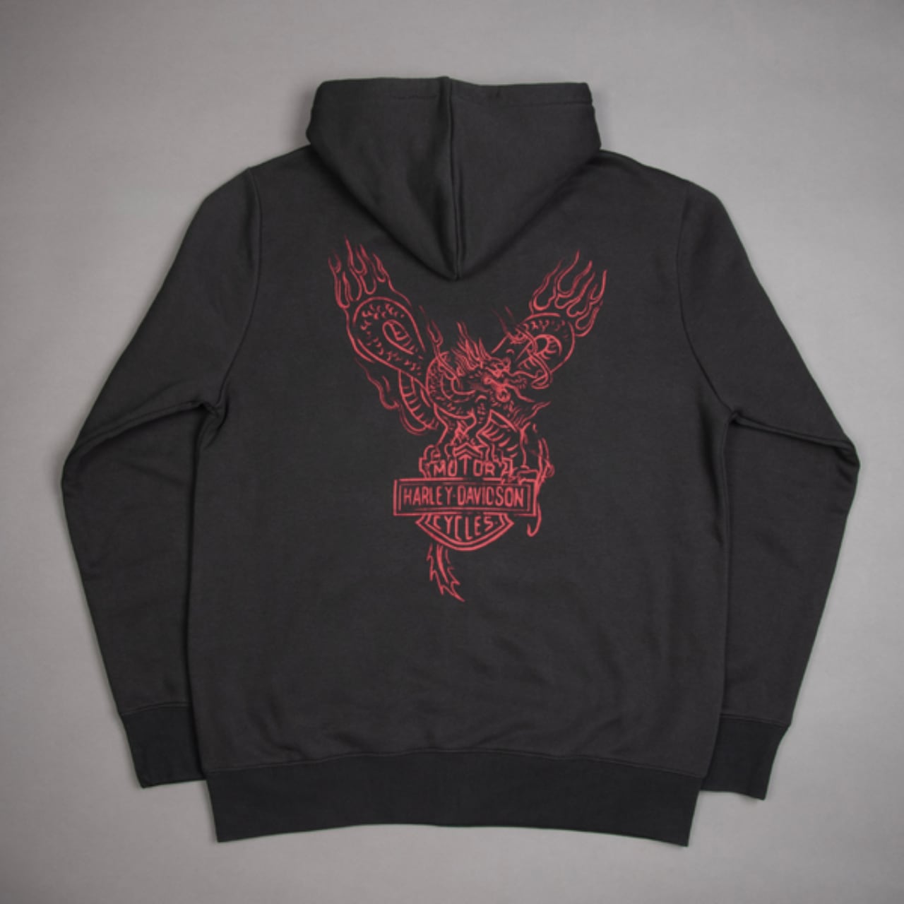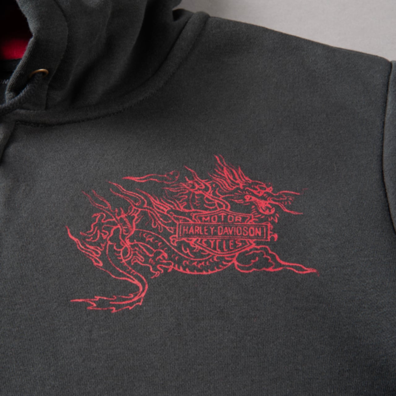 左胸と、バックには炎を吐くドラゴンの刺繍グラフィックが施されており、さらに存在感を際立たせています。