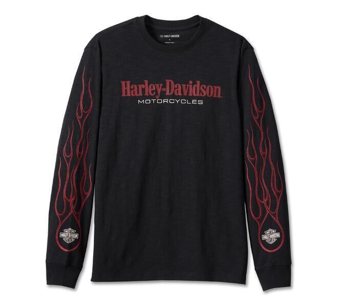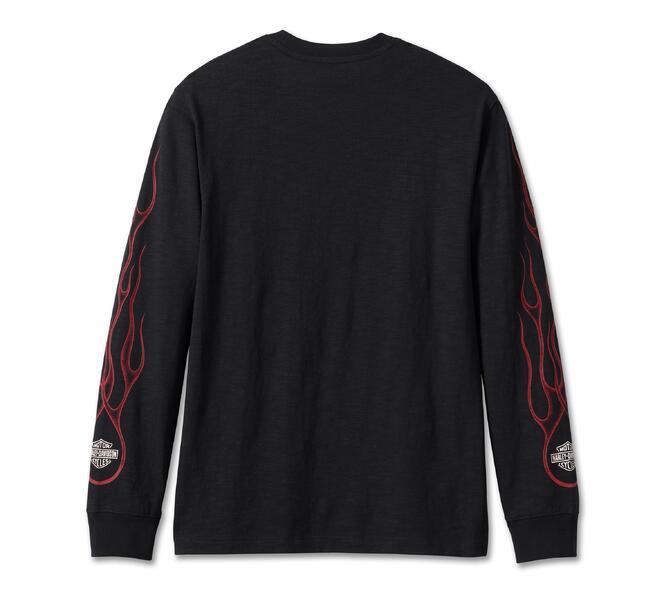 袖に施されたフレイムスのプリントが、個性的なアクセントを加えています。