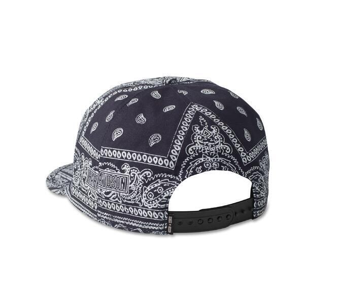 全体に施されたバンダナ柄のプリントがユニークな魅力を放ち、フロントの中央には織りラベルがアクセントとして存在感を引き立てます。
